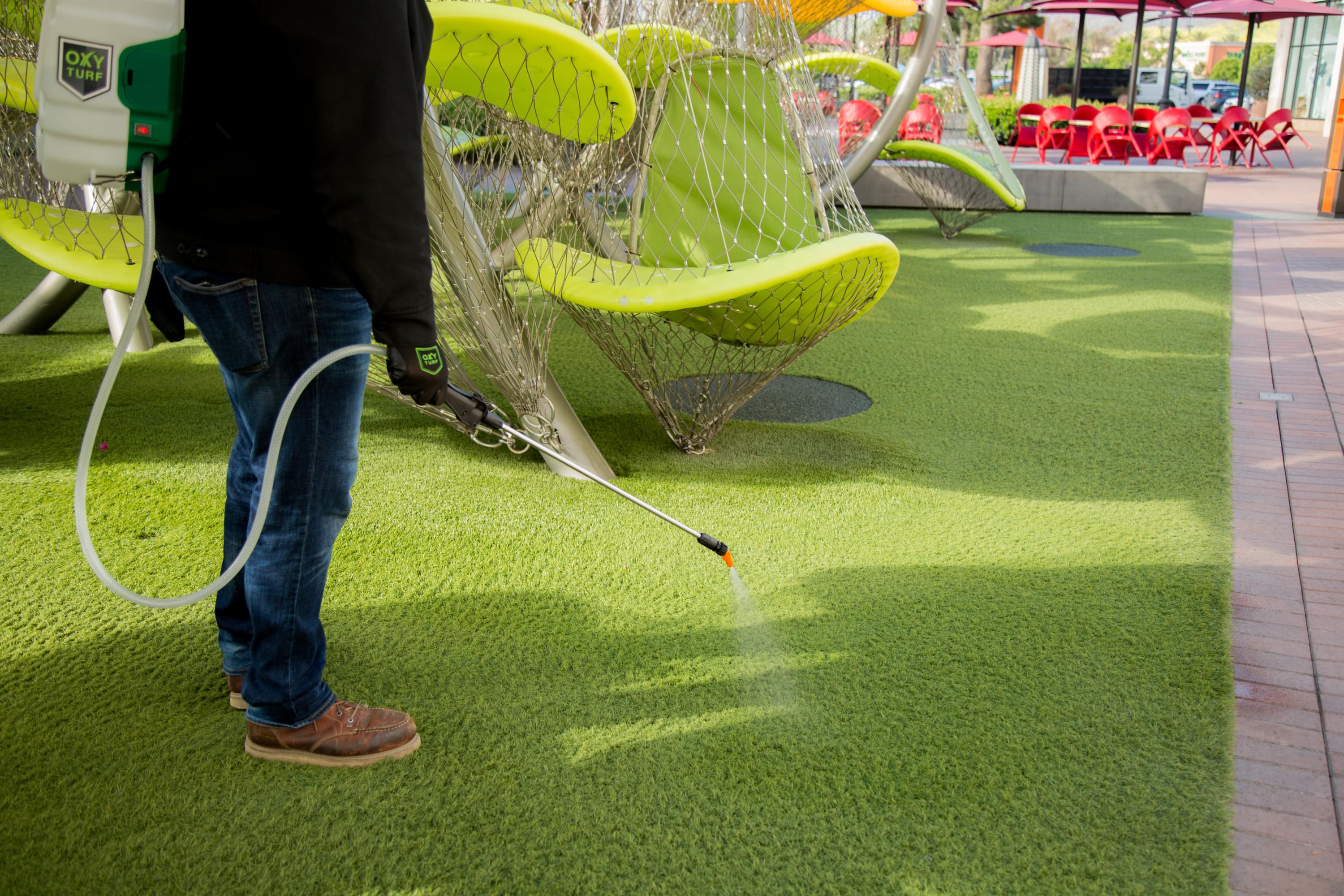 • To use OxyTurf synthetic turf disinfectant for ongoing protection, Ready to use formula. Spray it, let it sit for 10 minutes. It kills all odor, disease, and harmful bacteria. The most accessible product to use on the market, and the most effective